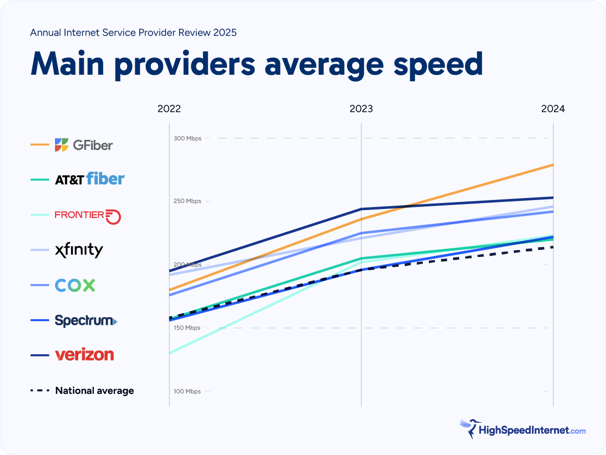 Brightspeed is the fastest internet provider in the U.S., with an average speed of 290Mbps, far surpassing last year’s top speed of 242Mbps. The new speed record distinguishes Brightspeed in a new tier with the usual speed champions such as Cox, Xfinity, and Verizon all lingering closer to last year’s numbers. The only other provider that comes close is Google Fiber at 279Mbps, but Brightspeed is still comfortably ahead. Brightspeed’s fiber connections likely outperform Google Fiber’s by an even greater degree than represented in our data, as our analysis does not filter out Brightspeed’s considerable DSL customer base.